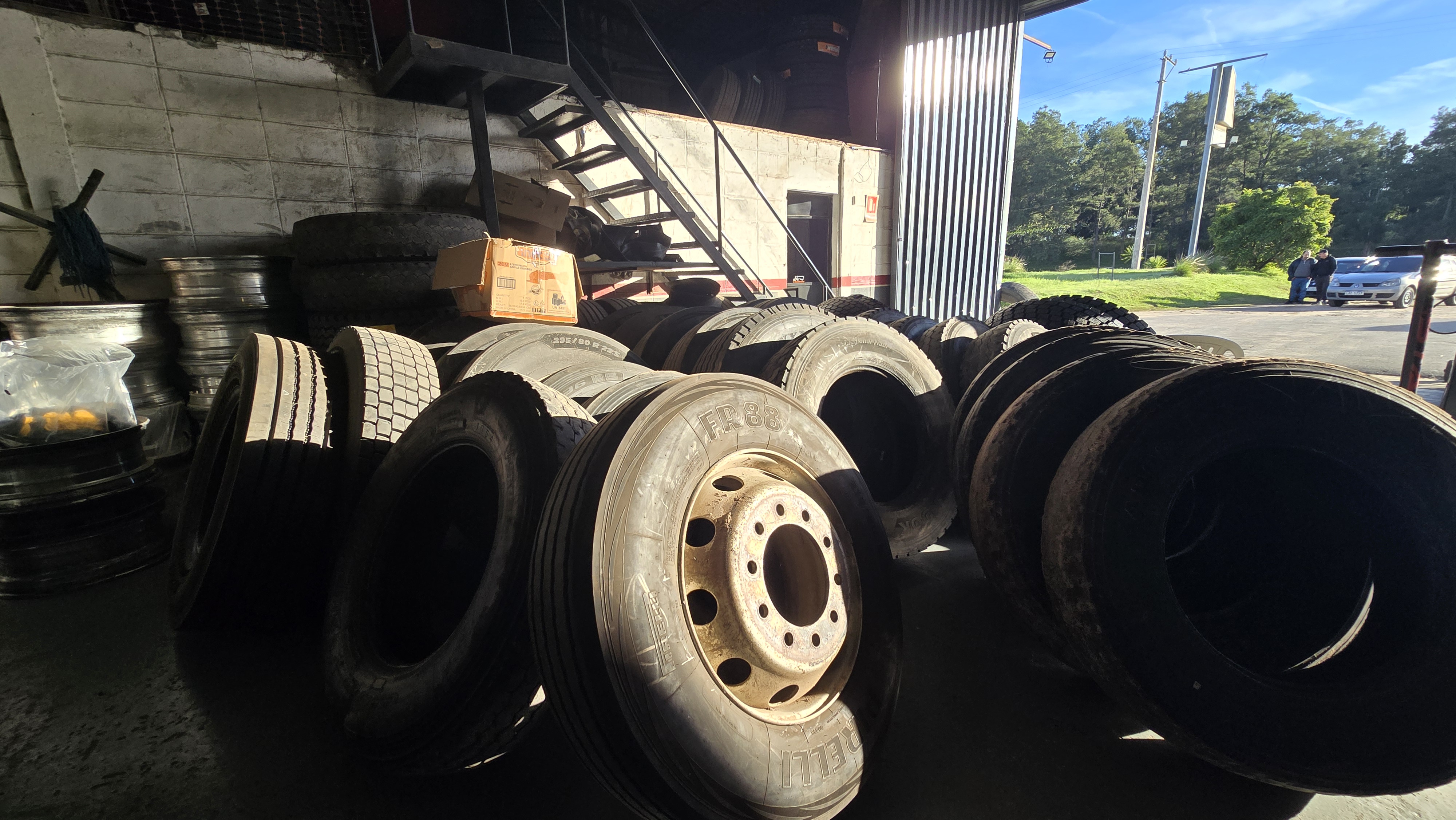 En un inicio hacíamos casi todos los camiones de Fraylog, en lo que tenía que ver con alineación, balanceo y rotación, pero de la parte de gomería no nos encargábamos. Luego tuvimos una reunión con los directivos de la empresa y llegamos a un acuerdo que ya tiene cinco años. Le hacemos el servicio de gomería a la empresa de transporte forestal, Fraylog, tanto acá, en Fray Bentos, como en Centenario. Ahora vamos a Durazno también, siempre con Fraylog que nos da el espacio físico; nosotros ponemos las herramientas, los empleados, le llevamos todo el stock y nos encargamos de la compra y el seguimiento.